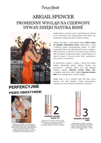 O tym, że Natura Bissé nigdy nie zawodzi, doskonale wiedzą gwiazdy, które pragną olśniewać na czerwonym dywanie. Niedawno udowodniła to Abigail Spencer, aktorka znana m.in. z seriali Suits, Mad Men i Grey’s Anatomy. W rozpoczętym sezonie filmowych wydarzeń i nagród, Abigail zwróciła się do hiszpańskiej marki, aby pomogła jej przygotować skórę na błysk fleszy.