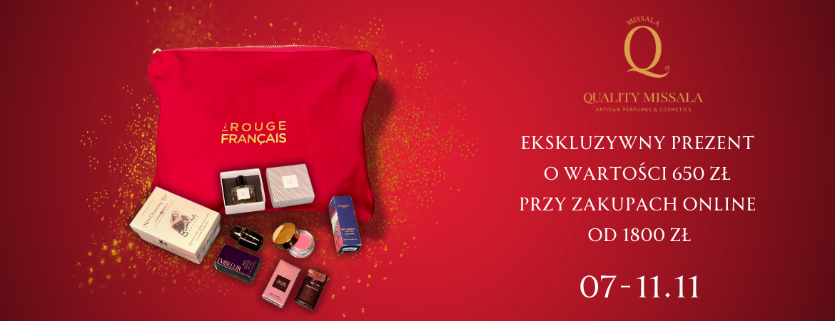 Przy każdym zamówieniu od 1800 zł dołączymy ekskluzywną kosmetyczkę wypełnioną upominkami o wartości 650 zł. W środku czekają dwa pełnowartościowe produkty z regularnej oferty oraz cztery miniatury perfum i pielęgnacji – idealny zestaw na podróż, testy i… małe przyjemności bez okazji: mydełko Gamila Secret Original, róż Zénobie Le Rouge Français, miniatury Eight & Bob Original, Floraïku Paris One Umbrella for Two, Menard Embellir Liquid i Tom Ford Café Rose.